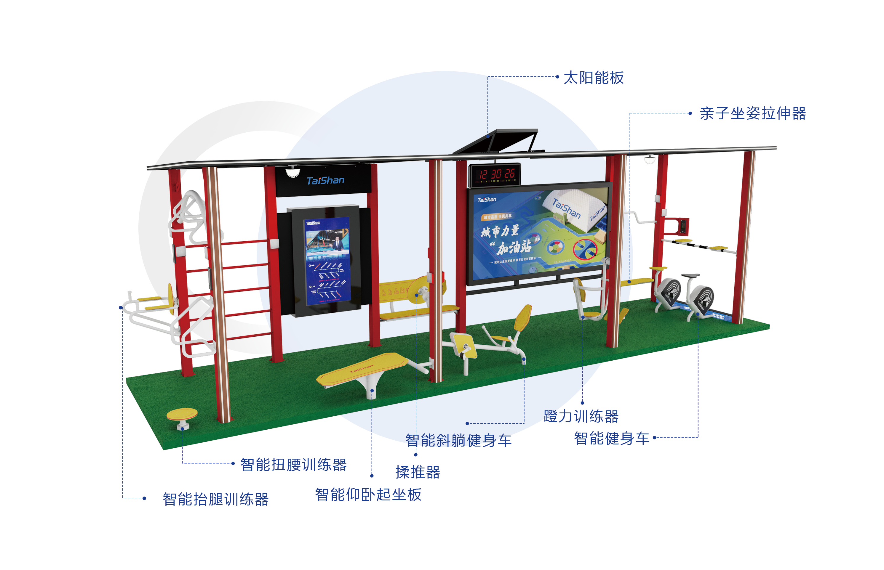 综合健身公交站是由乐鱼集团完全自主研发设计,适用于城市公交候车区域的“城市力量加油站”。综合健身公交站配备多种健身项目,能够根据城市需要设计不同健身项目与功能的移动室外健身驿站。依托物联网+互联网和5G技术,能够充分发挥城市运动新型体育服务综合职能,为运动人群提供更多科学健身指导,为城市居民打造更健康的生活方式。公交候车亭在城市的广泛使用,为乘客在侯车时提供躲避日晒雨淋的短暂场所,随着城市的发展以及科技的进步候车环境大为改观,综合健身公交站已经成为城市一道靓丽的风景,多功能化、智能化候车亭将缓解候车时的焦虑情绪,改善人们出行的愉悦心情更是提高社会和谐的有效手段。